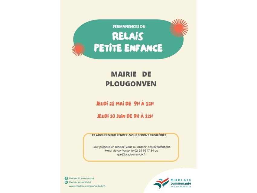 Les prochaines permanences du Relais Petite Enfance de Morlaix Communauté auront lieu à Plougonven :