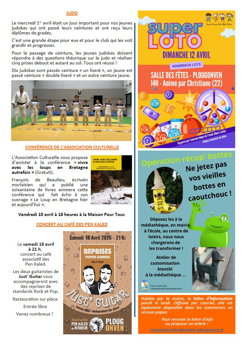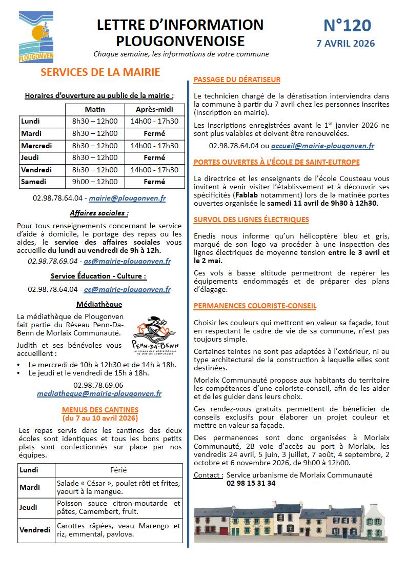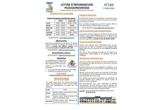 Lettre d’information du 7 avril 2026 (n°120) Mise à jour le 07/04/2026 Mots-clés : Communication Lettre d’information Cette semaine, lundi férié oblige, la lettre d’information paraît le mardi. Télécharger la lettre d’information du 7 avril 2026 (n°120) : Au format pdf : Au format jpeg (page 1) : Au format jpeg (page 2) :
